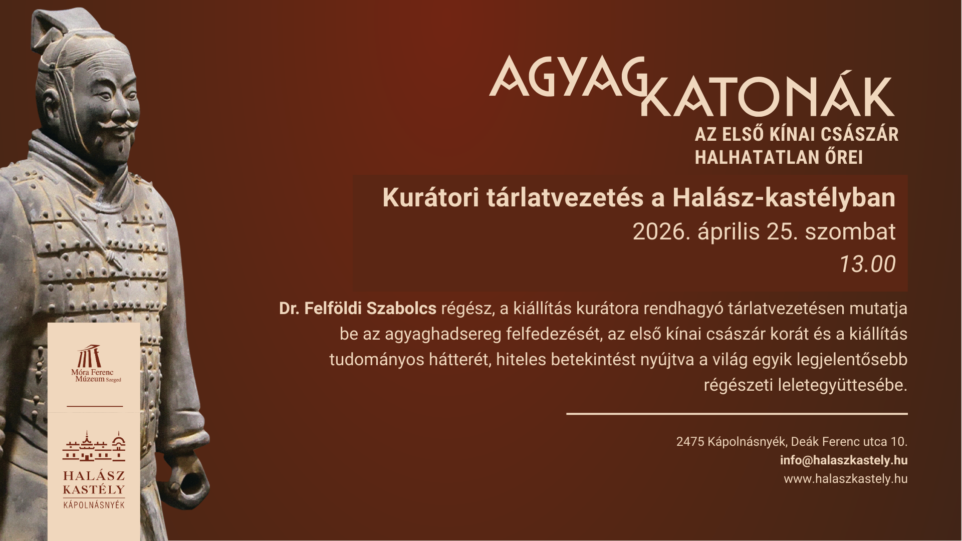 A hatalmas érdeklődésre való tekintettel ismét egy kivételes tárlatvezetésre invitáljuk Önöket! 2026. április 25-én, szombaton 13 órától különleges tárlatvezetésre várjuk az érdeklődőket 2 turnusban a kápolnásnyéki Halász-kastélyba, az „Agyagkatonák – Az első kínai császár halhatatlan őrei” című kiállításunkba.