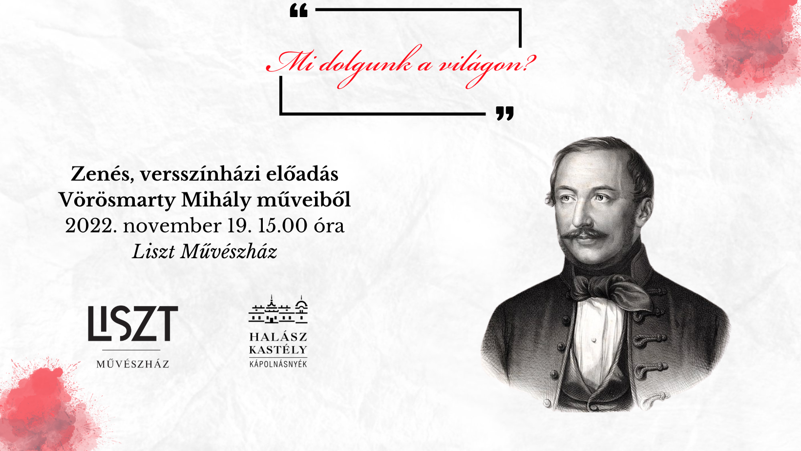 Versszínház a költő Vörösmarty halálának évfordulóján. Lázár Balázs, Tallián Mariann színművészek és Csörsz Rumen István régizenész előadásában.